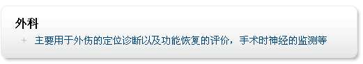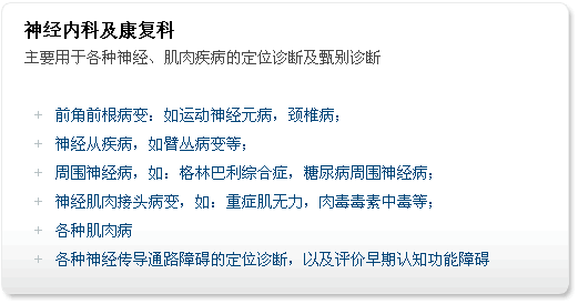 在临床医学上,电生理检查是神经系统检查的延伸,是组织化学、生物化学及基因等检测不可替代的检测技术。用于确定周围神经肌肉系统和中枢神经系统的功能状态及可疑病变,检出亚临床病灶,对病损精确定位。对周围神经疾病、脊髓病、脱髓鞘病、颈椎病、糖尿病、各类神经损伤、康复治疗评价、感觉及运动功能评价等的诊察确定。目前广泛应用于神经内外科、手外科、骨科、小儿科、康复科、内分泌科、肛肠科、耳科、眼科、泌尿科、性功能科、法医鉴定、职业病及运动医学等。